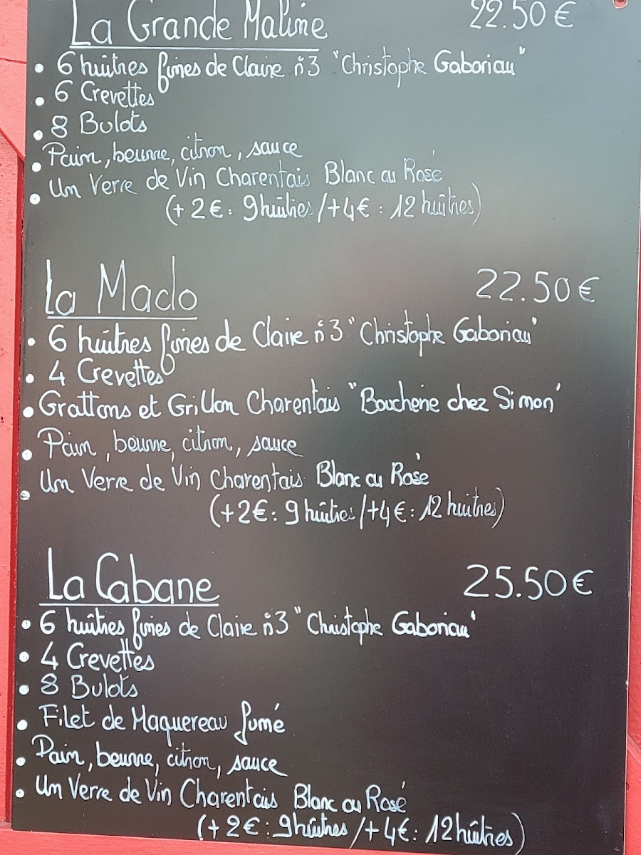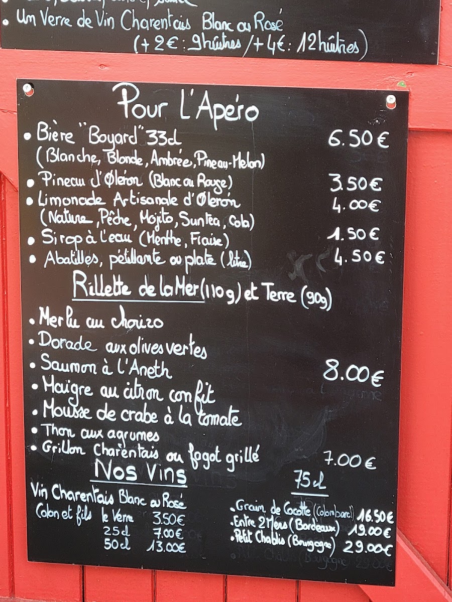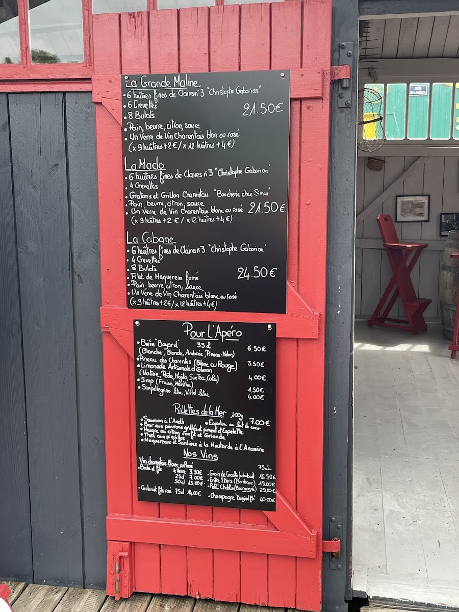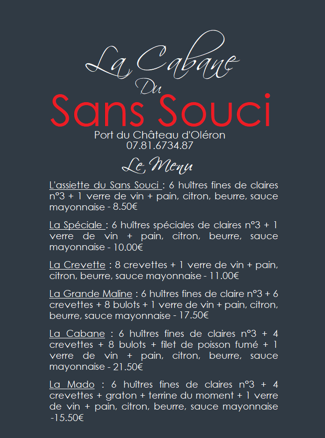 In conclusion, the menu at La Cabane Du Sans Soucis offers a simple yet memorable showcase of local flavors that reflects the character of the region and its coastal setting. The freshness of the seafood stands out immediately, especially in dishes like Huîtres Et Crevettes, which capture the briny, clean taste of the sea and highlight the restaurant’s commitment to quality ingredients. The drink selection complements the food perfectly, with Un Vene de Vin Charentais offering a pleasant regional touch that pairs naturally with shellfish, while the Biere Locale provides a more casual, refreshing option that suits the relaxed seaside atmosphere. Overall, the menu feels thoughtfully curated rather than overwhelming, focusing on doing a few things very well. As a reviewer, I found that this focused approach, combined with fresh products and local beverages, leaves a lasting impression and makes the dining experience feel authentic, unpretentious, and truly connected to the area.